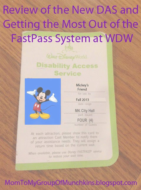 I confess I made more than a few phone calls to Disney to get as much information as possible about the new DAS system which replaced the old GAC on October 9, 2013. The cast members were courteous and as helpful as they could be though I couldn’t get definitive answers about how they would handle my unusual situation with four children being on the spectrum and there being a total of eight of us . I was directed to pretty comprehensive information on their website. I’m posting links, but in case you can’t get to them I’ll tell you how to navigate there. Go to DisneyWorld.com. In the right hand corner you’ll see a HELP drop down menu. While holding down your left mouse button, select the “Guests with Disabilities.” This will bring up a new page. On the disability page, select, “Guests with Cognitive Disabilities.” There are helpful suggestions there regarding stroller rentals, rider switch, and break areas. There is a pdf guide you can download with information specific to each park. There is also a link to a page dedicated to the Disability Access Service card.
